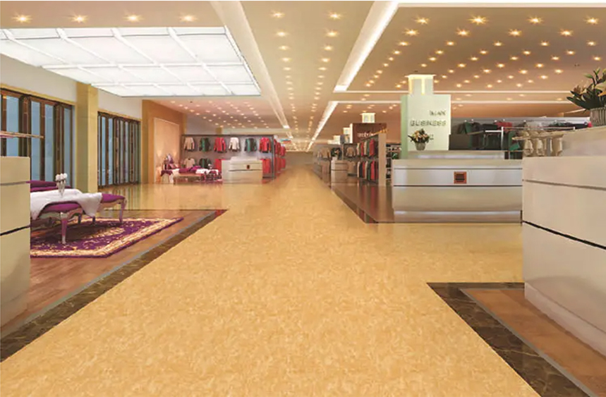Multi layer dense PVC flooring material, with surface patterns that remain unchanged under the protection of a transparent wear-resistant layer. The strengthening layer and dense backing layer make the product have excellent pressure resistance, dynamic roller load, and stable size that is not easily deformed. Excellent anti slip, sound-absorbing, noise reducing, and wear-resistant properties, lifetime wax free.